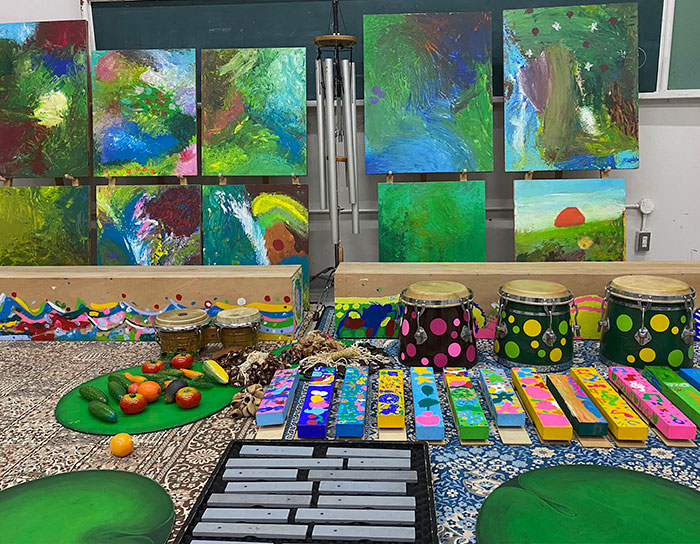 美術と音楽を同じステージに取り入れたワークショップ「森と海と川と河童のためのパーカッション・シンフォニー」は、2008年、いわき市芸術文化交流館アリオスにて誕生しました。そしてその後、有志により結成された「OVO NOVO」(新しい卵の意)によるラスト・ステージが「音楽と美術の4つの物語〜パーカッションと壁画のための作品〜」というコンサートでした。